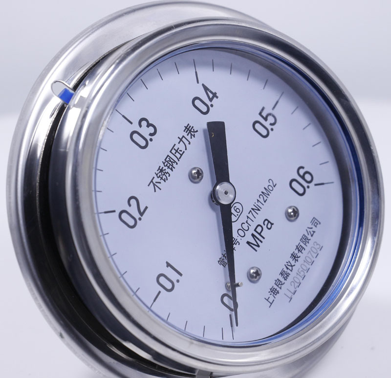 儀表由導壓系統(接頭、彈簧、螺釘等)、齒輪傳動、示數裝置(指針與度盤)和外殼(表殼、表蓋、表玻璃)組成。外殼為密封型結構,有效保護內部原件受環境影響和灰塵侵入。對于在表殼內充液(硅油或甘油)儀表,可以抗工作環境振動和減少介質壓力的脈沖抖動,起到很好的作用。